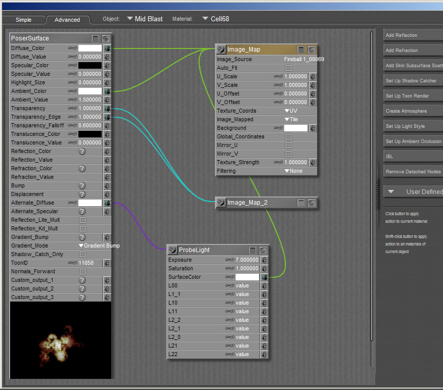 3- I created 2 custom textures for this set (which I will make available as soon as I clean them up with material presets). One is the smoke ring effect, one is the fireball effect I used for the core