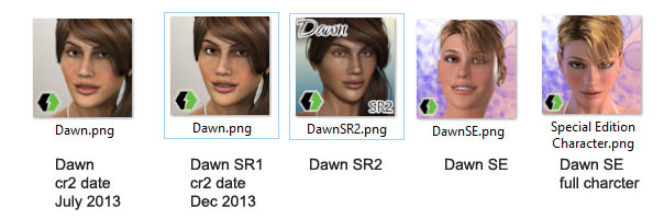 Thank you for that.The Dawn that comes with Poser is Dawn SE (Special Edition. That's the only version that has been sold since she was released.