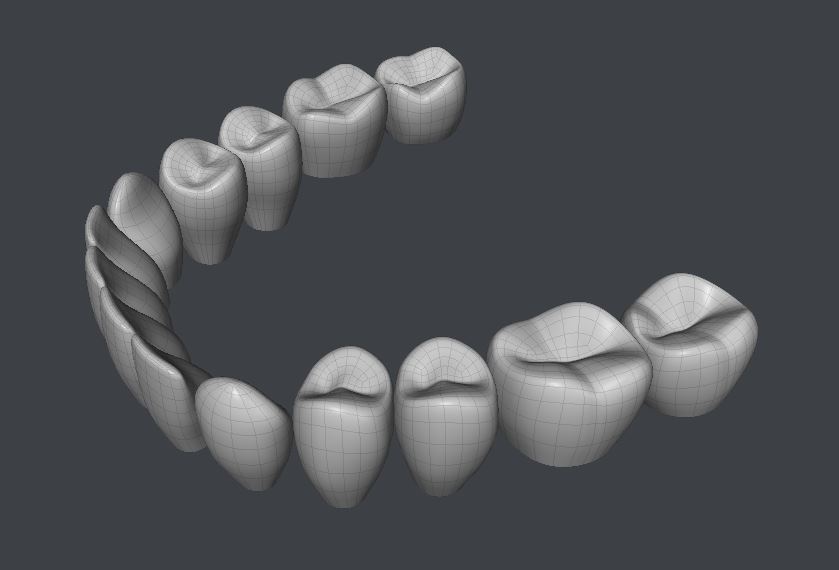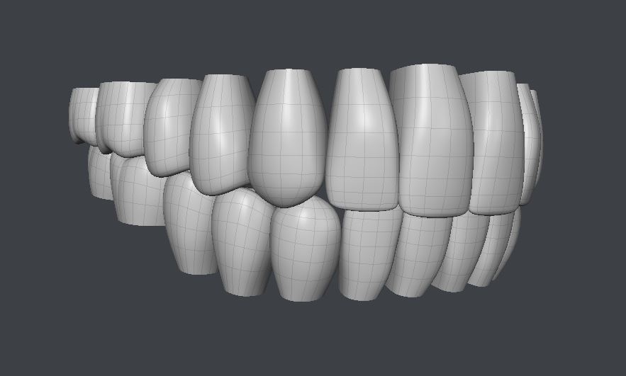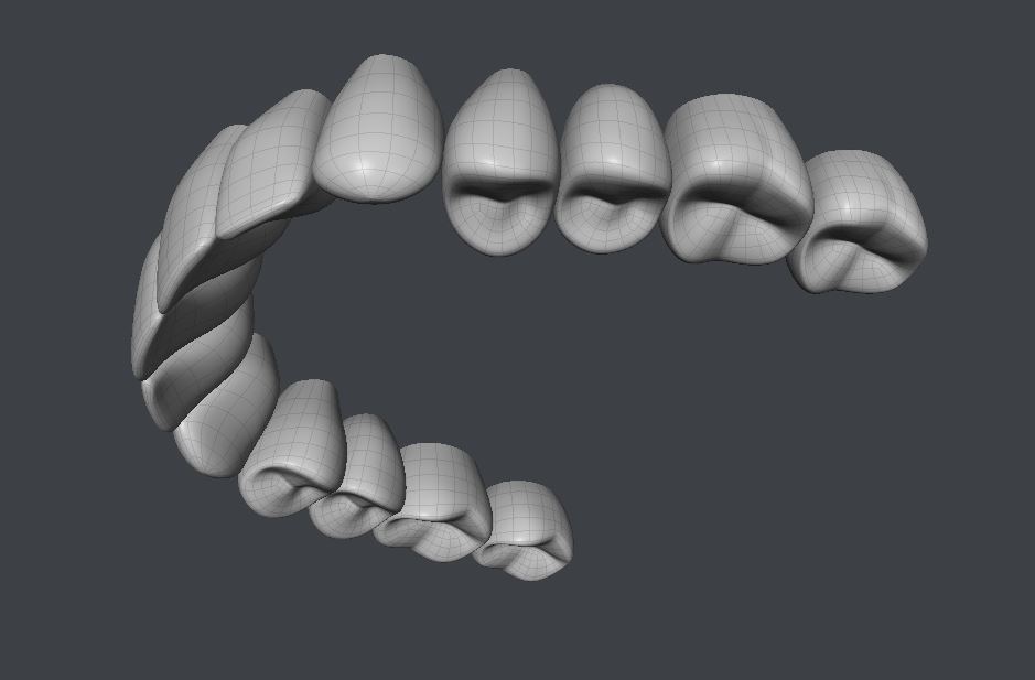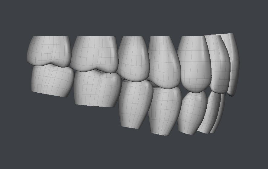 Can I suggest that before you finalize their thickness you try rendering them with translucency and/or SSS to make sure they're properly translucent at the edges without needing to make the whole tooth translucent and glowy?Here are Dawn's new and improved quad teeth. On to gums and tongue next. Then her new base mesh should be done.