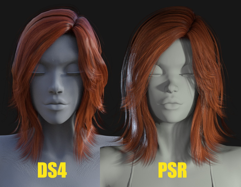 As for popular demand, here is a side by side comparison of the original Leiko hair in DS4, rendered in I-ray with original materials with the default HDRI dome, and then the converted version in Poser rendered in Cycles with classic 3-point lights (no HDRI), using the basic material conversion based on texture maps. Looks good to me. :)