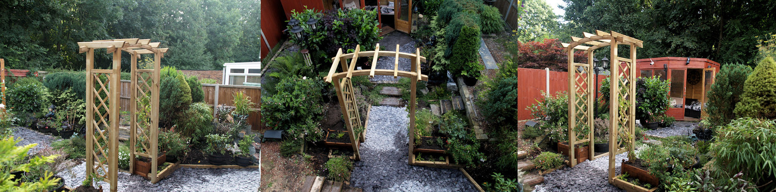 This time there is left, above and right. The are two climbing plants against each side of the arch, all are fragrant and evergreen although one drops some if it leaves in really cold winters. On the right side the flowers are red and yellow and on the left red and white. Flowering should be from early spring through summer until late autumn. The heathers should give some colours over the rest of the year. More flowers are to follow and there are also some bulbs planted. A bit more planting tomorrow and hope fully adding lights to the path.