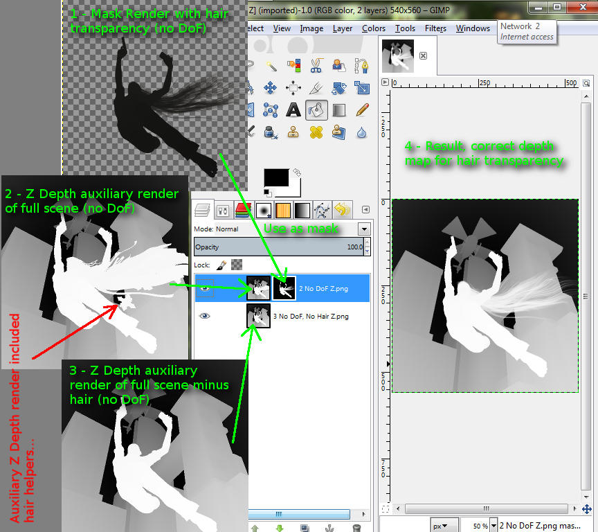 First, I had to do two separate Z Depth renders, one with the hair visible and one with it invisible, and then I created a mask by switching off all background objects and lights and rendering. I had to do a little fiddle with the mask in GIMP (invert it, overlay it on a black background, and tweak levels), and then I used it to combine the two depth maps as shown below: