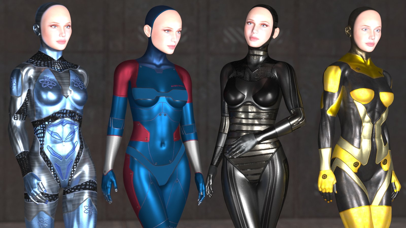 I did an easy fix, I changed a number of the panels to be a see-through mesh;With the human faces I now think the Blue-Burgundy one looks more like a human, just wearing a Sci-Fi suit, then a cyborg.