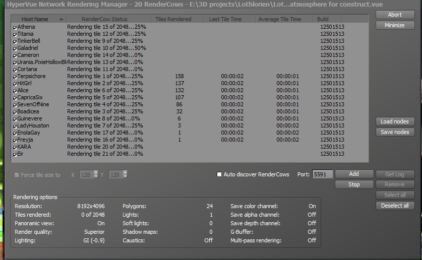 I bought another 5-rendercow pack for my Vue Infinite 2014 license. This morning, running a panorama (skydome) of the Pink Paradise atmosphere, at 8192x4096 pixels at superior quality. This atmo is notoriously difficult/slow to render.