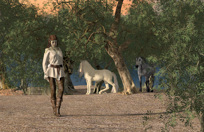 Olive Grove by ShaaraMuse3D, Hivewire Horse by Hivewire3D, Dapple Grey for HW Horse by CWRW and Smokey Cream for HW Horse by Dreamweaver, Faylinn for V4 by Godin, Elleth Hair by Propschick, Fire Princess Boots and Trousers by Rhiannon, Aria Tunic by Tipol.