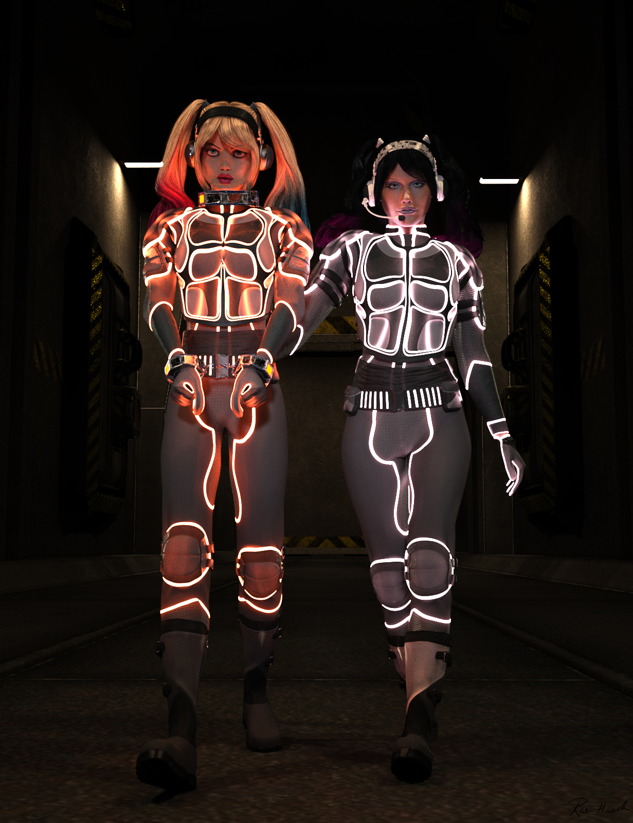 I love that, a real mix with the lighting but it works the scene itself looks decidedly dark implying a underground corridor or the like, while the suits gives the figures real punch. You should break out more often:).