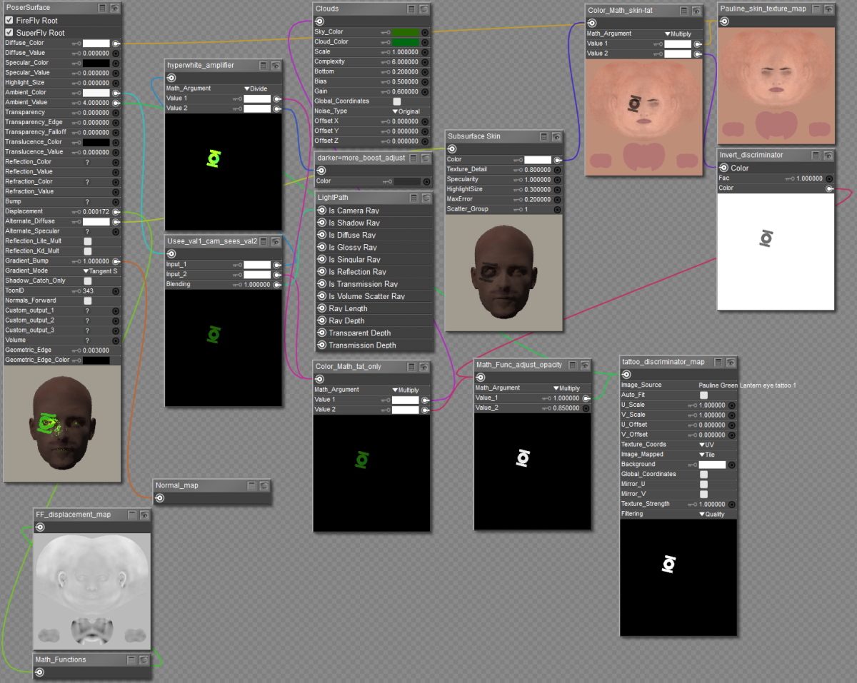 This material setup has a math node to allow for easy opacity adjustment of the tattoo: