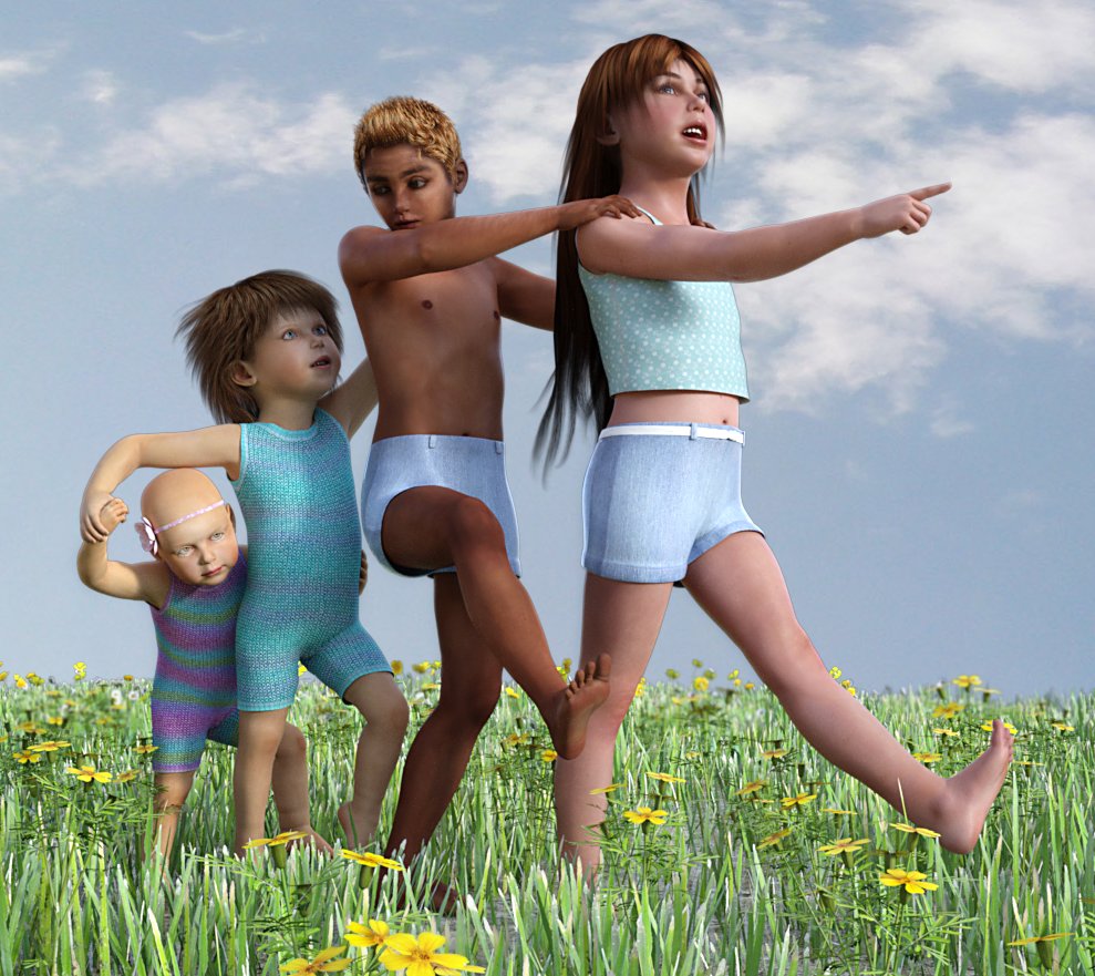 At the front of the lineup is Pendraia Fae's Diva for Dawn, then Jungle Kids for Diva from CWRW, NapalmArsenal and CG Cubed (a tiny bit shorter, slightly smaller head), then the upcoming Deirdre for Baby Luna- a beta version- by Pendraia (midway in size between Diva/Jungle Kids and Baby Luna, based on a child of around age 3), then Hivewire's Baby Luna herself (using the default size setting).