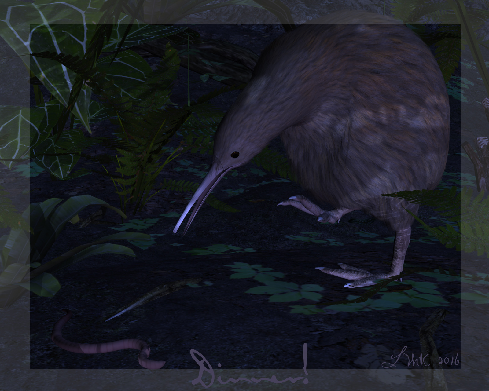 Dinner! starring Ken's Northern Brown Female Kiwi, Noggin's Worm (a freebie at Rendo) and Stonemason's Enchanted Forest.