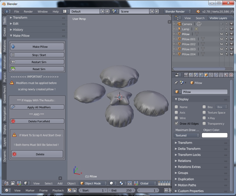 The last one is where I am currently trying to finalize, and have a working version to upload. I have been going round-n-round implementing, breaking previous code, fixing, breaking, fixing, etc., and I need to figure out how to get both the ApplySim/Delete Forcefield, and the Delete Pillow/Forcefield to play nice with each other as well as not affect anything else one might have in scene (bed, couch, object, empty, curve, etc.). I had the delete working last week where it would not affect anything else in scene, but as of right now, I somehow broke it again, and am currently trying to find the correct solution without breaking the sim apply/delete.