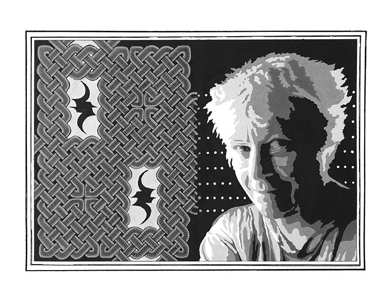 The midterm from my Art 501 class taken just a few years ago, so relatively current. Entailed mixing acrylics, doing posterization of a photo taken with one main light source, and then we were supposed to add something representative of ourselves and our interests. The Celtic interlace was fairly obvious. The other symbol was a modified #7 which I'd already used in a pattern-making assignment earlier in the semester.