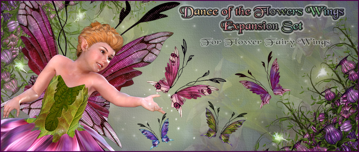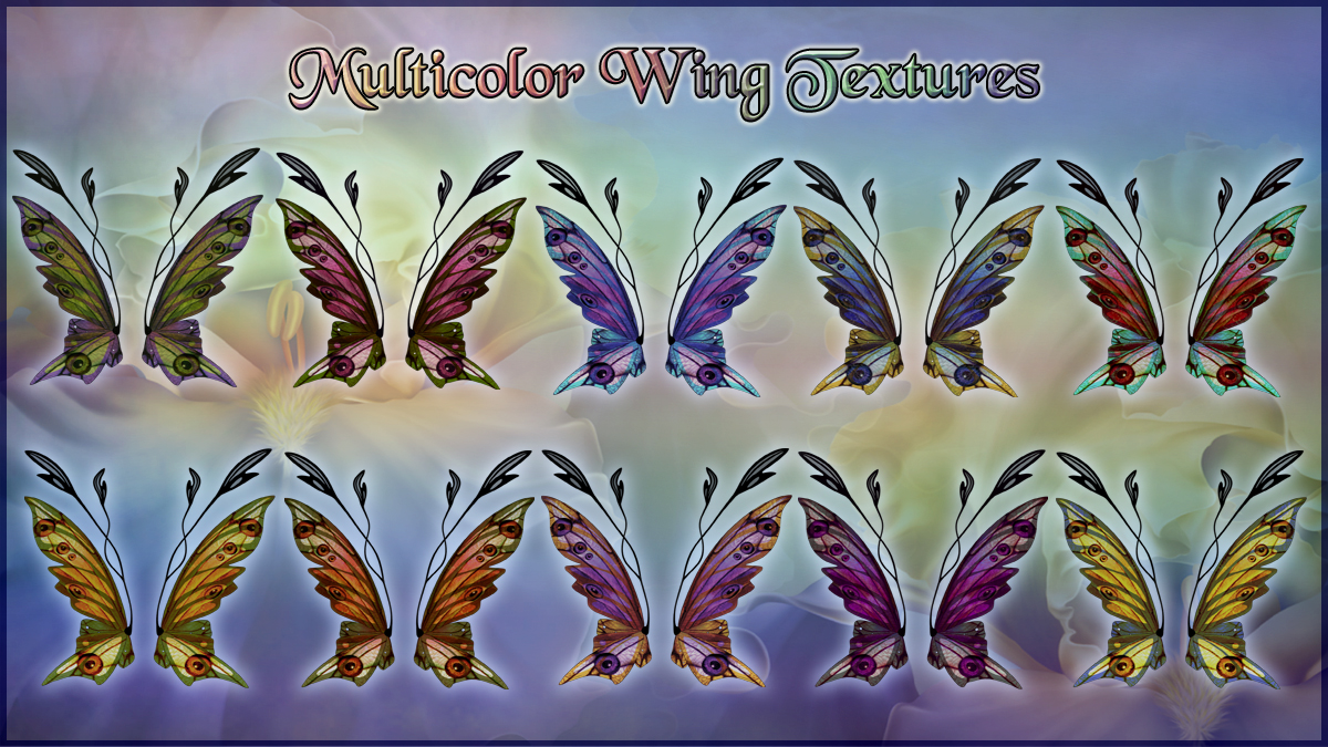This Expansion pack is for Dance of the Flowers includes 10 Multicolor Wings, 8 eyed wing textures, 8 scaled textures, for a total of 28 different wing textures.
