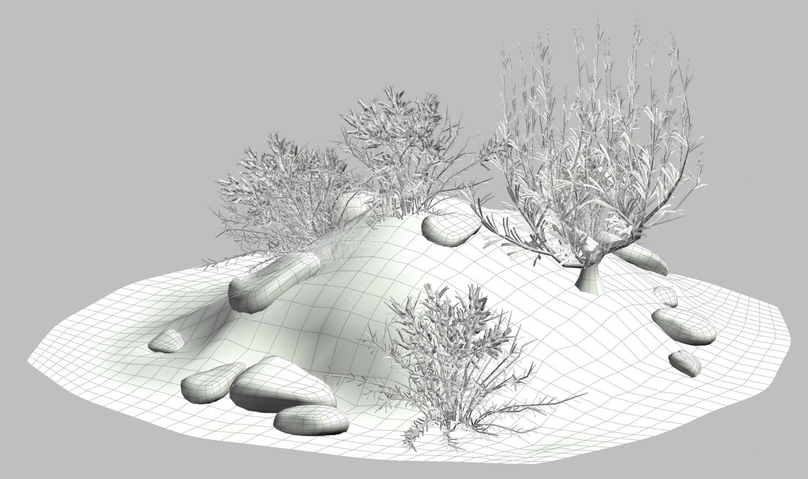 I worked this morning and cutting doen the polygon count on my Great Basin Sagebrush while thickening and adding height-- it looks a lot more like the actual species now. I'm guessing the overall model is going to come in at about 200-225K polygons when done.