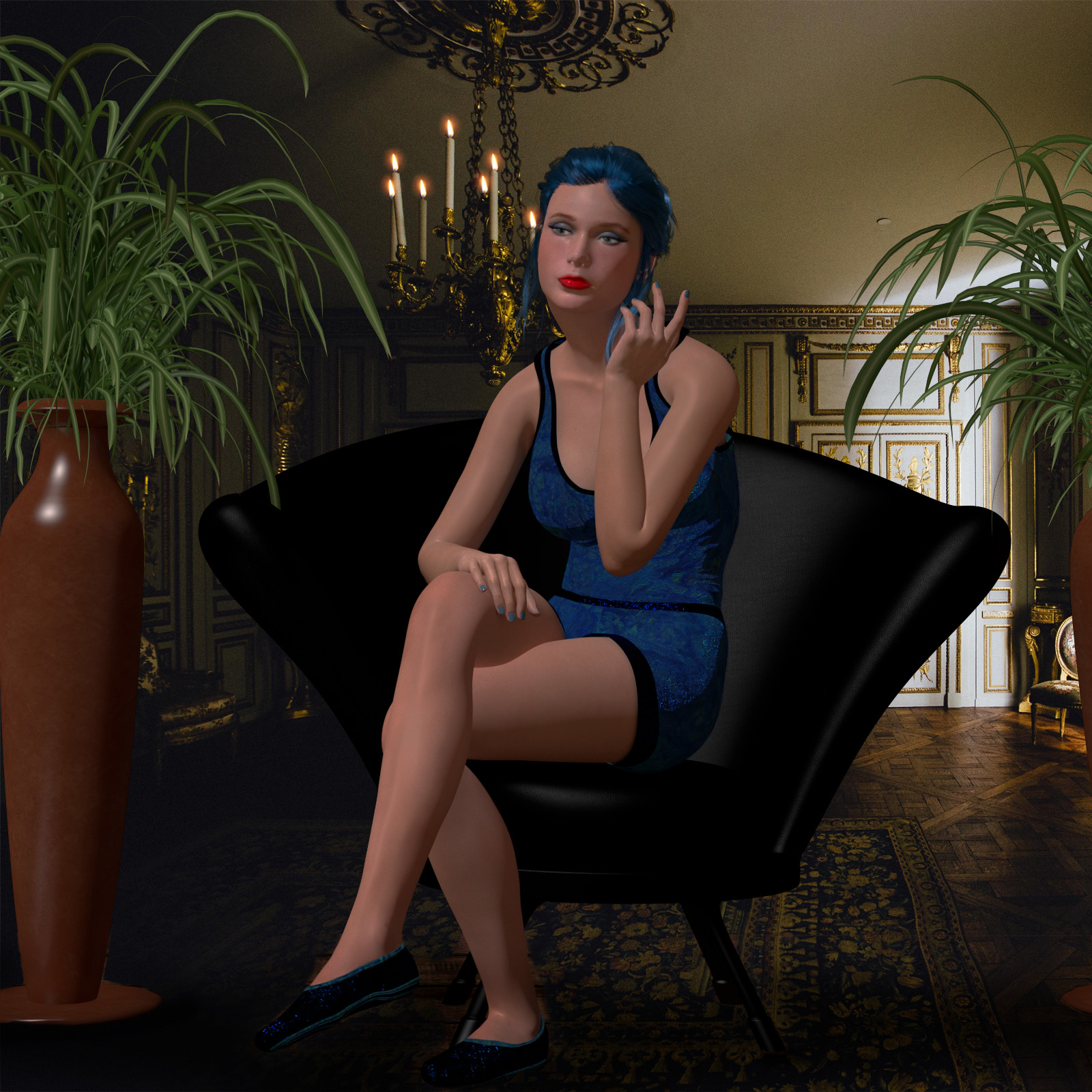 Very demure , Richard !This was one of the only promo's that I thought was more in line with posting here from my now live, in store pose packs for her. Yea, there is some Photoshop magic going on as I had to blend a background photo with the render and then add in some flooring, it was allot of work but it was worth the end result. The clothing was very basic as I had virtually no clothing besides the included swim suit for her and well in a setting like this or the other basic promos I just didn't think that was appropriate. So the top is from a Dawn 1 set, the shorts are from my Dawn 1 Training Gear set and the slippers I never released but they were just an obj that I rigged and gave similar textures to to match the outfits homemade textures. The render did include the chair and the tall vases with the plants.....
