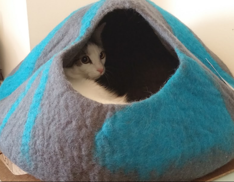Here is Tsuki in her new Felt Cat Cave which is sitting on the desk near my monitor. She was in and out of it all evening. Several times I looked over to see her hunkered down peeking out through the opening Then when I told her I could see her, she popped up and jumped out. She definitely believes she has the ability to turn invisible.