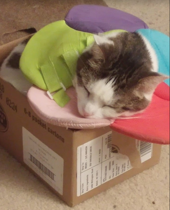 Glitter, when she's awake, she's generally trying to get into something she's not supposed to. So when she's napping, I'm recovering! She's in the same box right now staring at me. Either that, or she's sleeping with her eyes open!