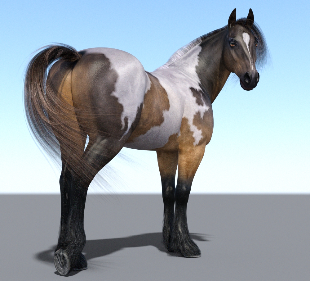 Anisotropy Rotations won't work for 3DL (Uber Surface) or Iray given the direction of the the hair (particularly the mane and Tail) on the diffuse maps are in different directions this also applies to the coat. The reason why this is needed is that each hair is a surface on it own and therefore will spread out the gloss along the hair. But you can adjust the rotation to suit the cam angle and get sort of close as shown in image 2 below. I used a value of 0.35 to rotate the direction of the gloss.