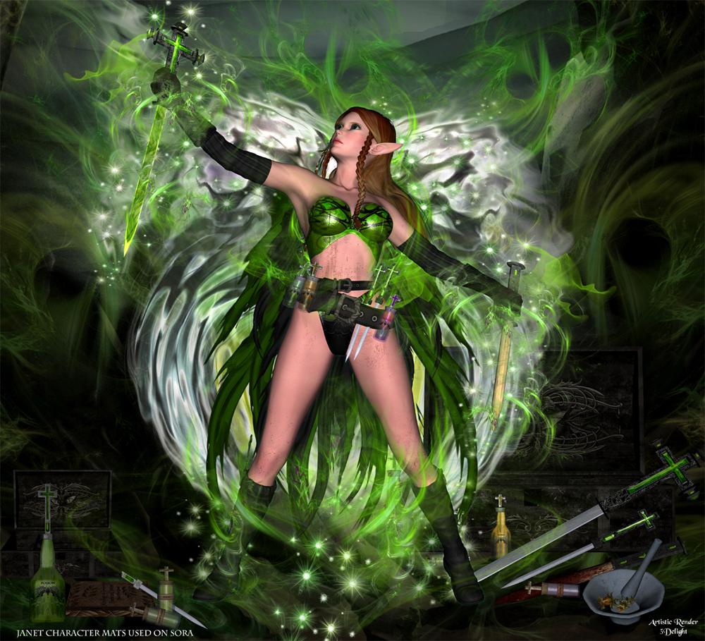 Products used: Supernatural Slayer Kit, Khel'Sing for Supernatural Slayer Kit, Sora for Dawn, Virtural World's Janet Character Dirty Mat option, Tenacity outfit with Juku textures, boots,belt, and sleeves are from Rogue for Dawn by Xurge, Fractals are from SRG Designs, Wings are painted in Photoshop, Wachiwi hair, background is created in Vue 2015.