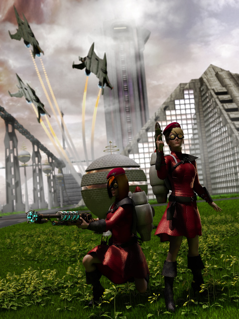 It's actually a bit of a kitbash from I think 2 outfits (might be 3, already packed up the workstation for travel so I can't look right now). One is the Steampunk Heroine for Dawn from Jonnte (Shoulder piece, most of dress, arm guards, holster, raygun on the one woman), the other was Powerage's Super-Vixens club for Dawn (boots, rest of bodysuit/dress). The beret was from Panko's Berrets for M4/V4 (unsure if it's still available), and the rifle was the steampunk Rifle with the Electro Power add on from Cybertenko. I re-textured the dress, bodysuit, shoulder guard, arm guards, and boots with materials from Parrot Dolphins sets. I can't remember which set the goggles were from. Poses from scratch.
