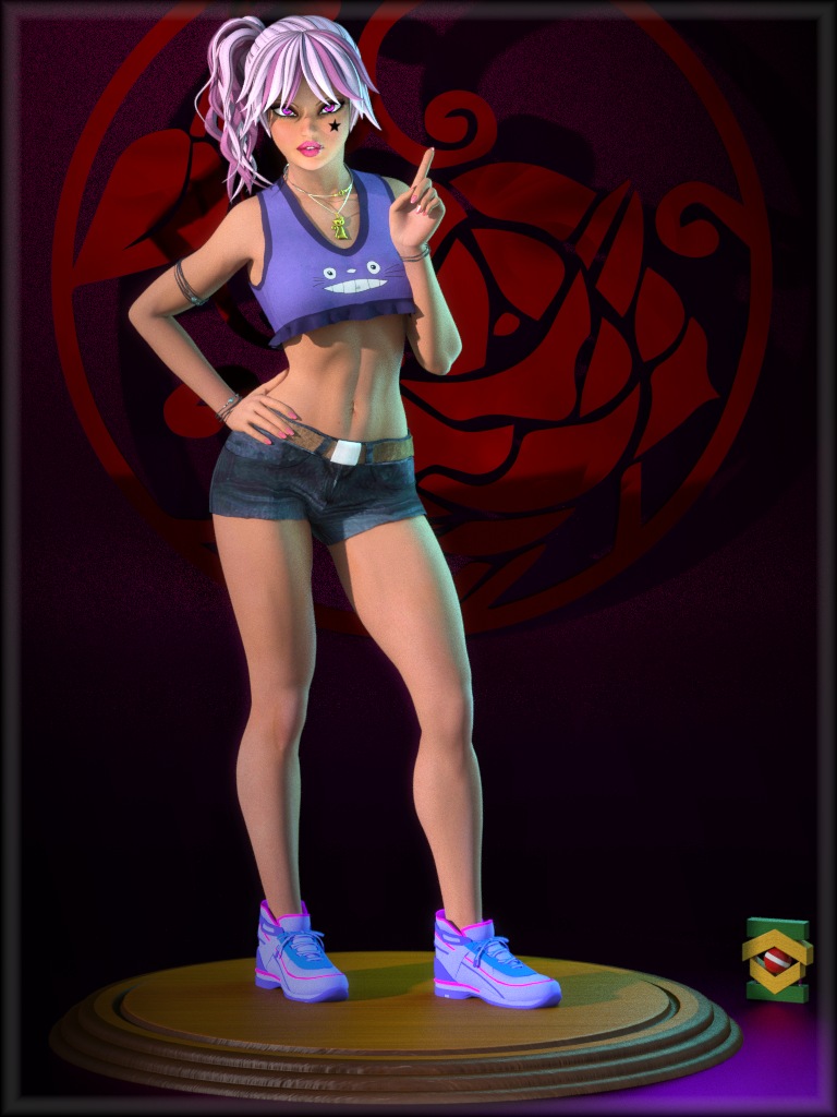 Now this is an Anime-stylized character shape I made using my custom body type morph, a bit of CatsEyes head mixed with DawnSE faces. The shorts, mini-blouse, pedestal, and backdrop rose emblem are mine. The jewelry was converted from V4. I've imported the sneakers from Metasequoia and rigged them for Poser to fit Dawn. Rendered in Poser with Superfly.