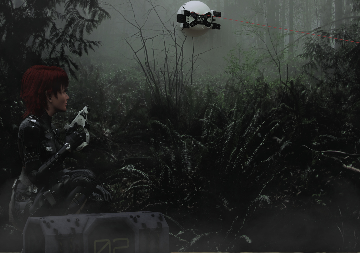 Caoimhe had struggled long and hard to recover the container from the drop zone and get this far, she was not about to abandon it easily. She hoped the tech built into her suit would mask her heat signature from the drone, if so, all she had to do was keep remarkably still. It worried her that the drone had activated it's laser sights, so clearly it had sensed something but there were so many other creatures that were active in the forest. The drone was clearly ready for action but so was she.