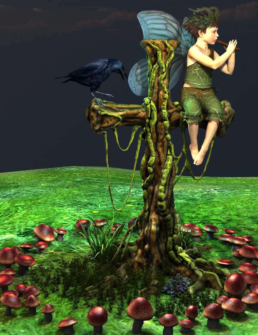 It was initially an attempt to use plants in a render but it kinda grew. First the bird arrived but he seemed lonely until a sprite took pity on him and played for him...