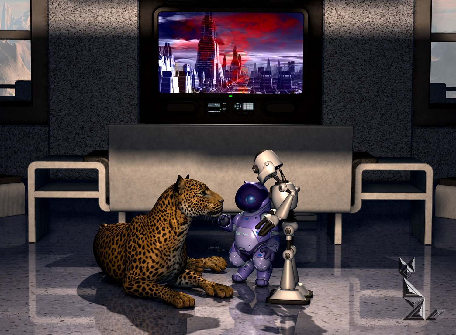 I like this idea. It's all yours. Maybe those cats come from a planet of sentient felines. The spotted one is looking at the black one and saying "I thought it was your turn to take her for a walk?", lol.