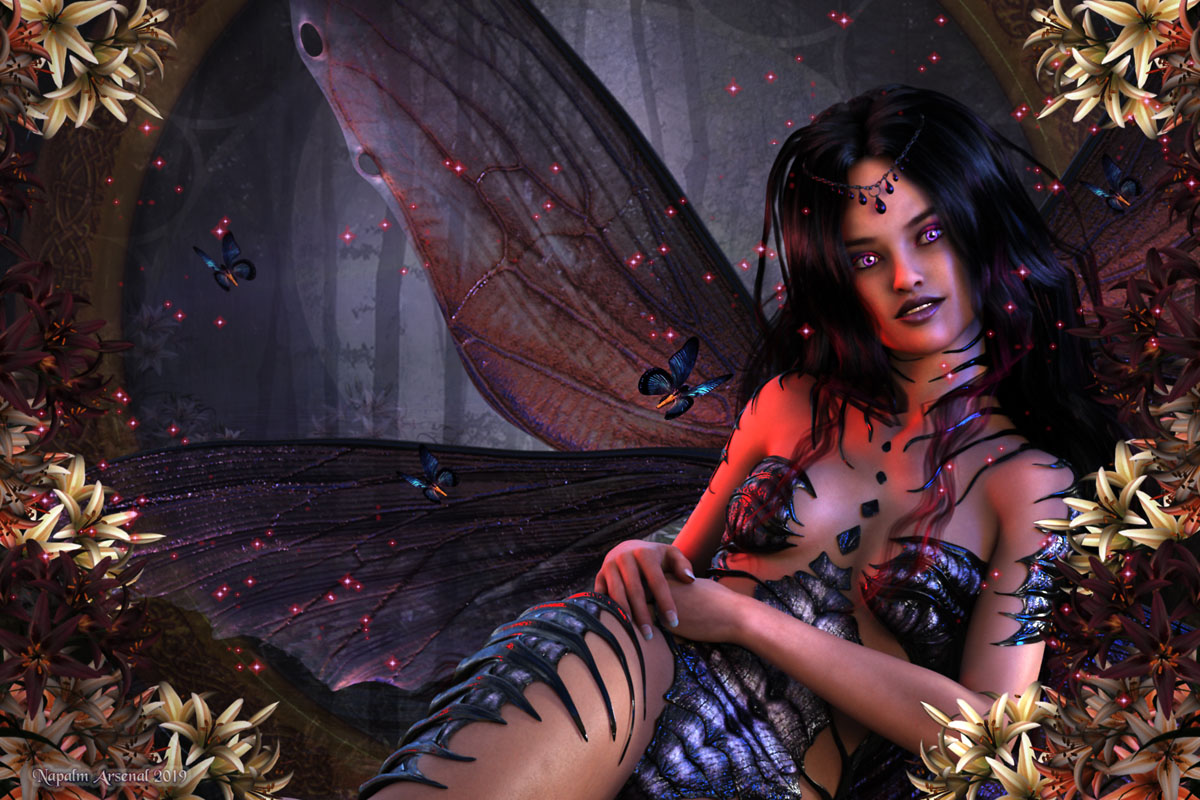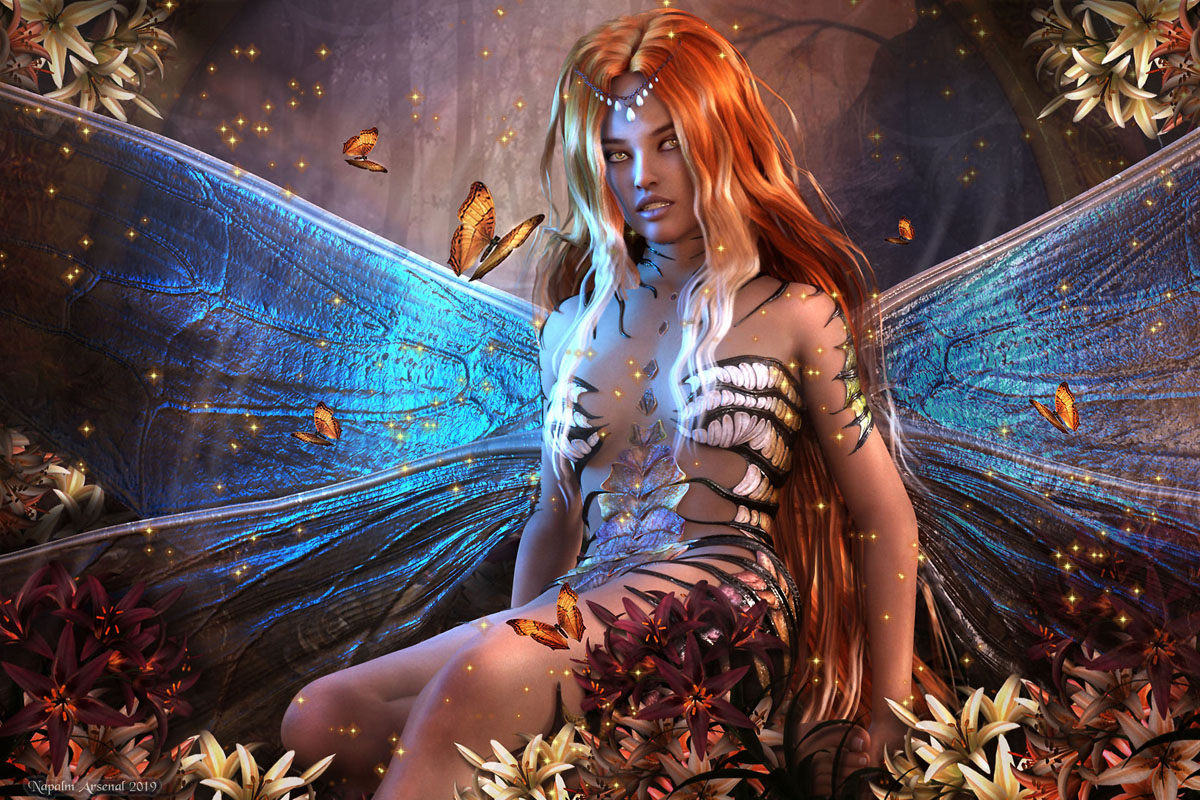 Products Used: Nylyssa by Mousso for Genesis 3 and 8, Meillyn outfit by Arki, Mid Summers Dream Hair, Lisa's Botanicals Asiatic Lily, Jungle Heat for Lisa's Botnaicals Asiatic Lily, Ultimate Butterfly Collection,Fabiana's HDRI Theory of Zen lights, Sveva's Iray Color Splash Lights
