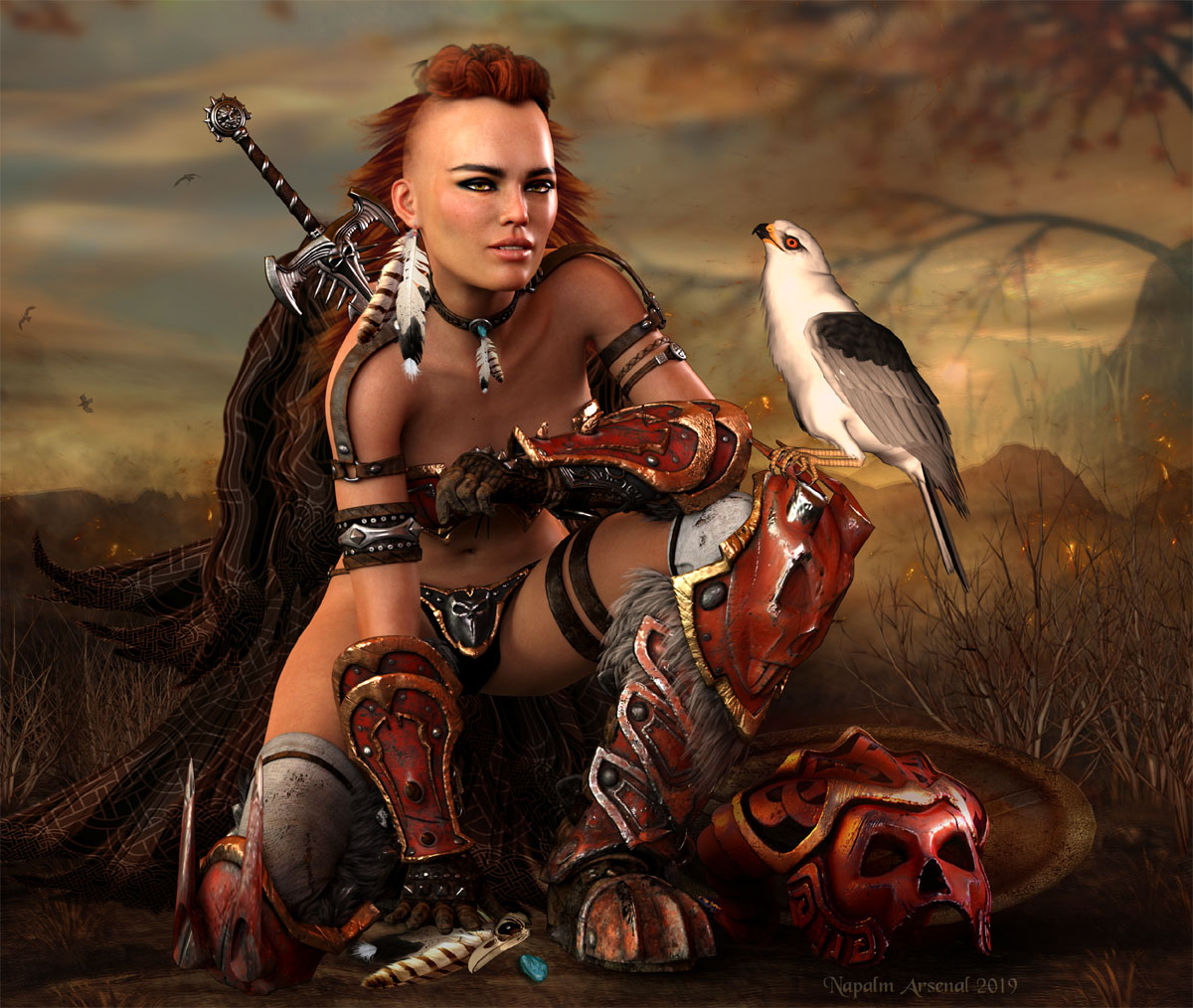 Products Used: Macarena for Genesis 8 by Mousso, Kadis Outfit and Weapons, Kadis Warmaster texture expansion, Lisa's Botanicals Dead Bushes, Songbird Remix's Birds of Prey, Viking Hair, Ron's Explosions, CWRW's Painted Ponies Bonus Pack Feathers, Cape is 2d, Raven Skull Jewelry