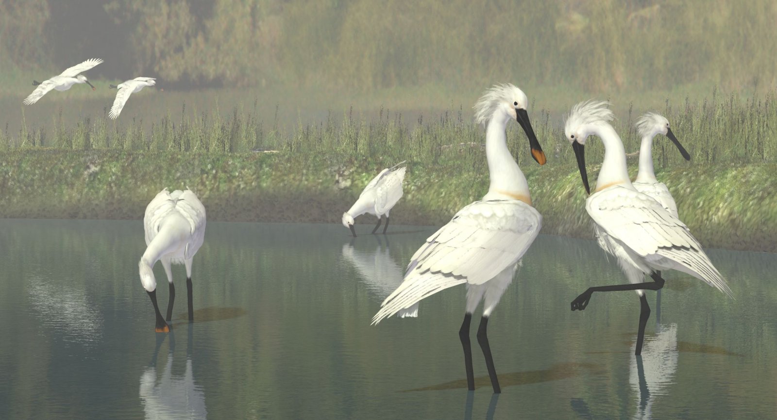 Here's another Asian bird-- the Eurasian Spoonbills. Spoonbills develop an orange breast patch and long crest off the back of the head during breeding season. The setting is Nerd3D's swamp (available here at Hivewire) with my Duck Pond water material added in place of the default water texture.