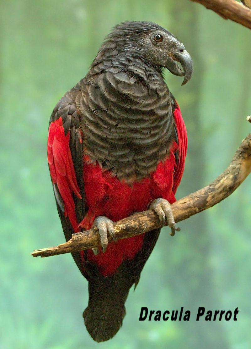 "ALSO KNOWN as Pesquet’s parrot or the vulturine parrot, the Dracula parrot is found only in the cloud forests in the foothills and lower mountains of New Guinea.