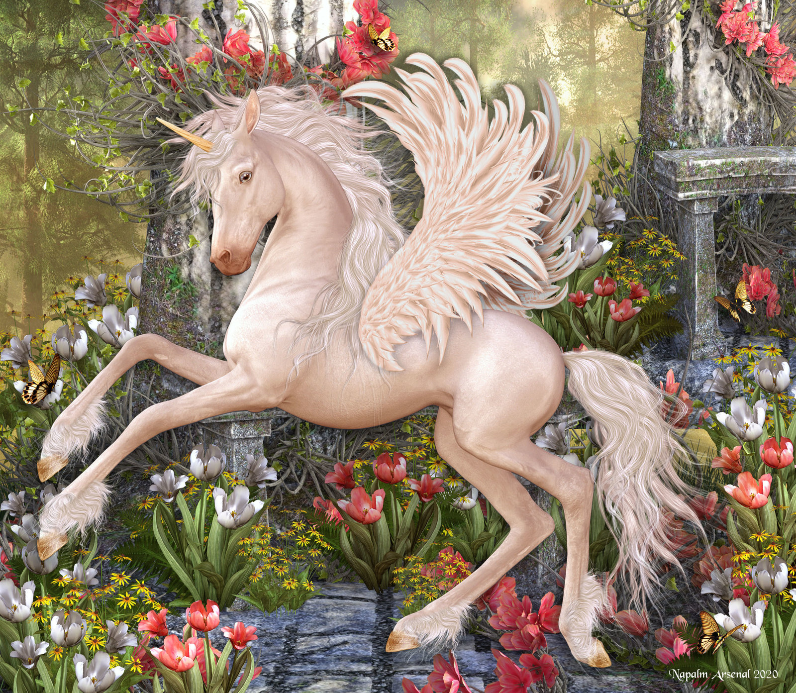 Created With: Whisper's gold coat, the Hivewire horse with my custom bubbles morph, Lisa's Botanicals tulips, Soft Pastels for Lisa's Botnaicals Tulips, Lisa's Botanicals Black-Eyed-Susans, Lisa;s Botanicals Cinnamon Fern, Ultimate Butterfly Scatter, CWRW's Mane and Tail 3, Wings are my creation and are 2D, background image is from Art By Mel