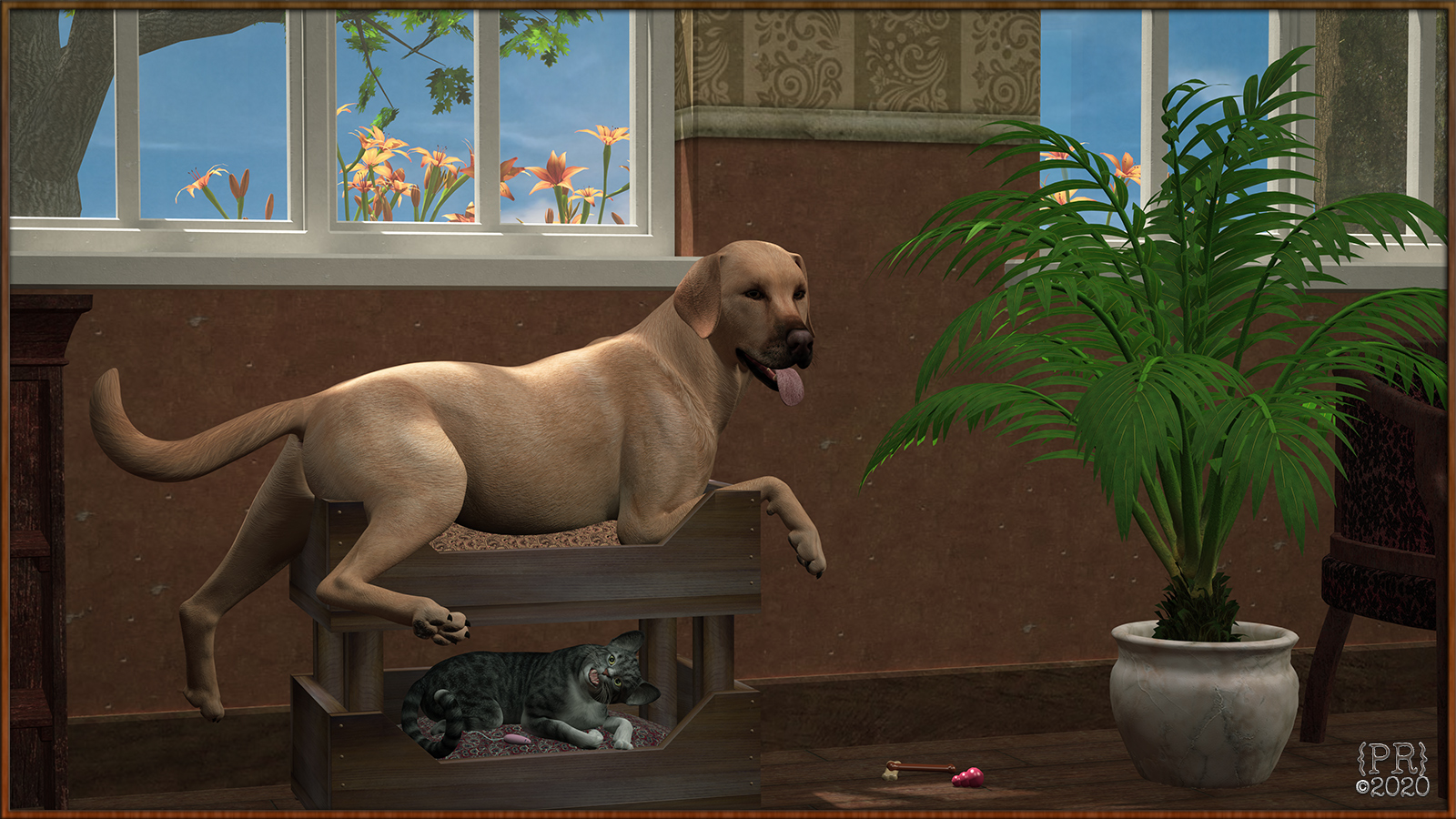 SCENE: Oak Tree, Potted Palm,* and Day Lillies* by Lisa’s Botanicals; Double Cat Bed by Mininessie*; Room and furnishings from DM’s Lost Moments; Cat and dog toys by me.