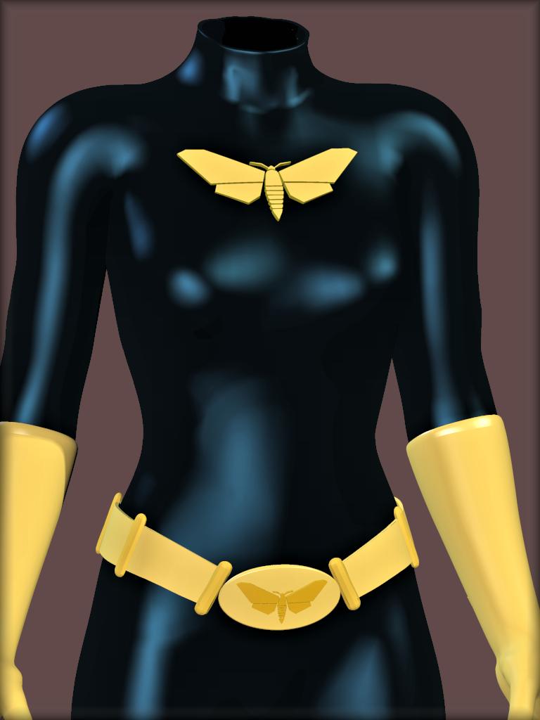 I love that there are associations with the hive...I'm thinking she should be called something like Queen Bee doesn't have the double d but it has a nice ring.Here's what I came up with for Moth Girl, emblem and buckle detail. Someone could think it's a butterfly because of the simplification, but the proportions would be different. Now back to the board for the Queen Bee.